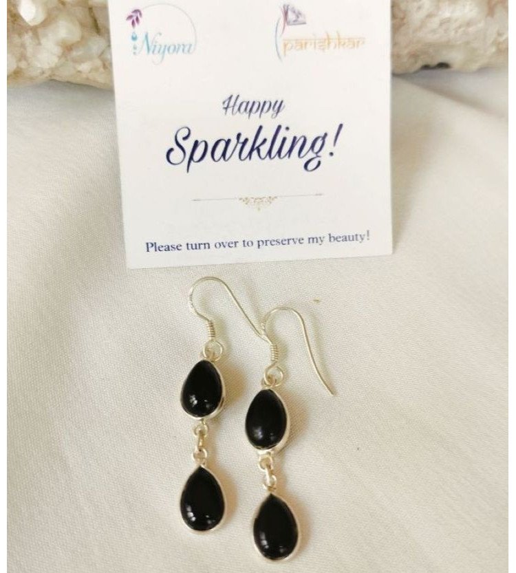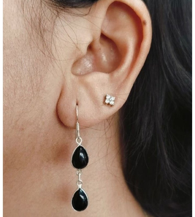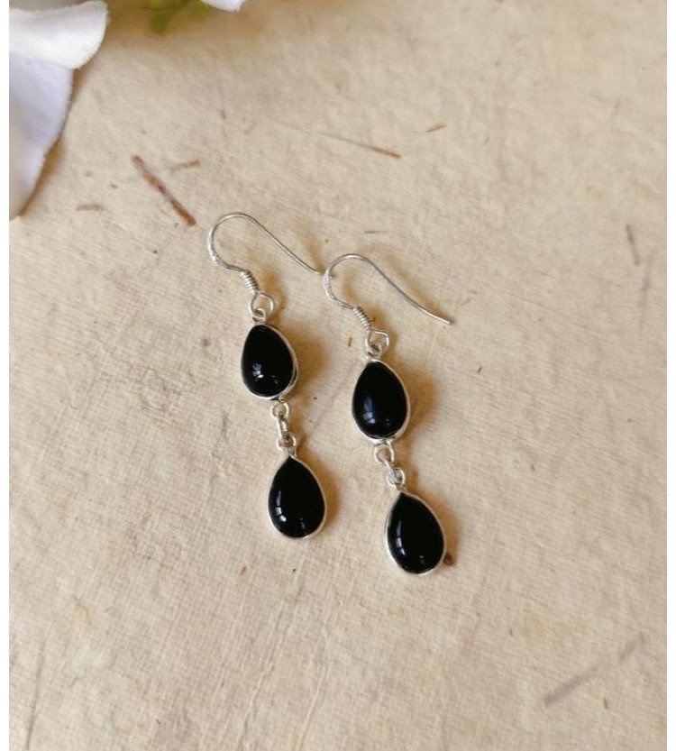 Elevate your style with our stunning Black Onyx Double Drop Hanging Earrings, featuring two beautiful pear-shaped cabochon black onyx stones set in 92.5 sterling silver. This dramatic piece is perfect for adding a touch of elegance to your look.