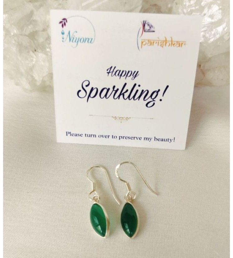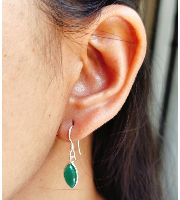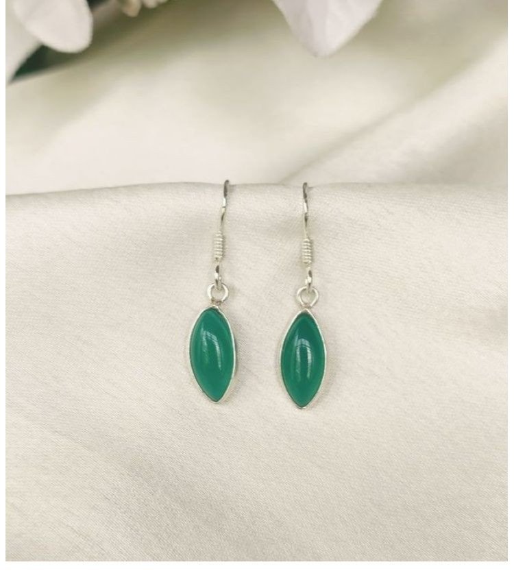 Elevate your style with our stunning Green Onyx Hanging Earrings, featuring beautiful marquise-shaped cabochon green onyx stones set in 92.5 sterling silver. This elegant piece is perfect for adding a touch of sophistication to your look.