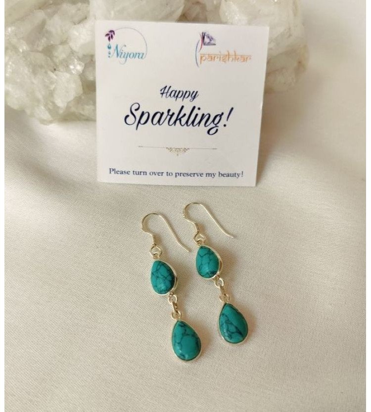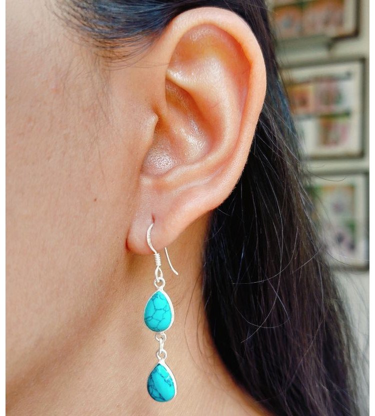 Elevate your style with our stunning Turquoise Double Drop Hanging Earrings, featuring two beautiful pear-shaped cabochon turquoise stones set in 92.5 sterling silver. This elegant piece is perfect for adding a touch of serenity to your look.