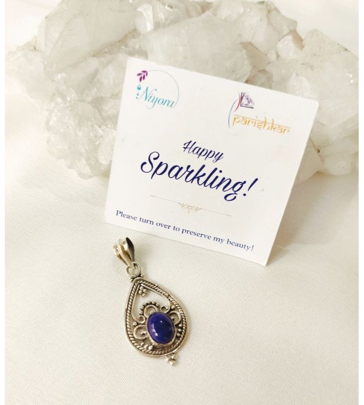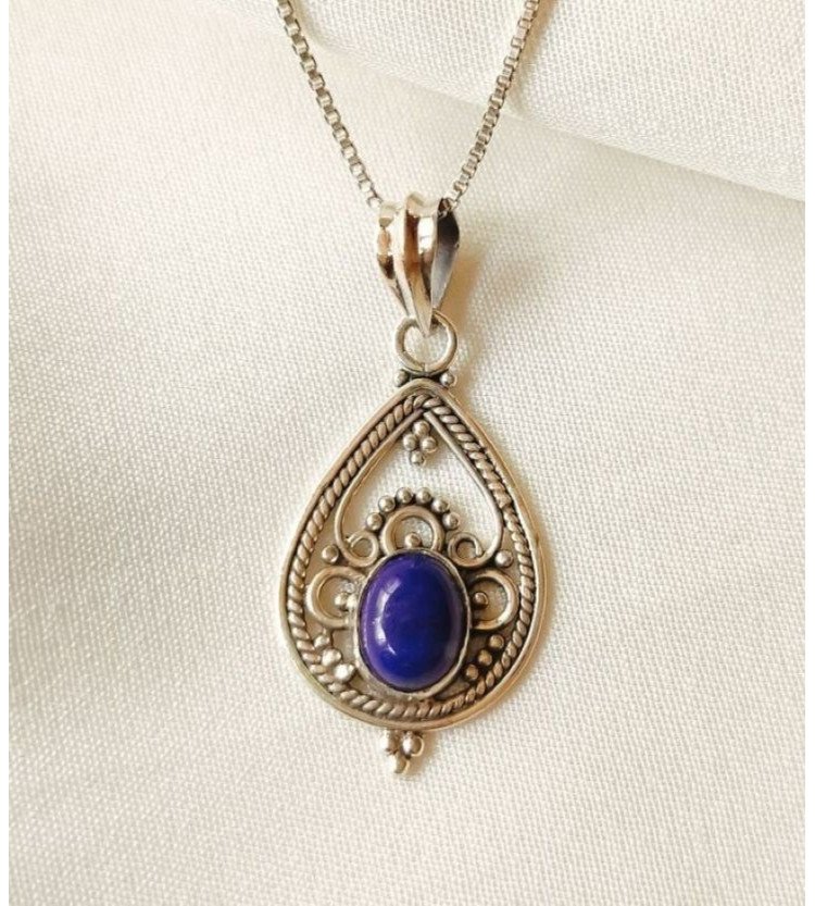 Elevate your style with our stunning Lapis Lazuli Pendant, featuring a beautiful oval cabochon lapis lazuli stone set in 92.5 sterling silver with an intricate pear-shaped design. This elegant piece is perfect for adding a touch of luxury to your look.
