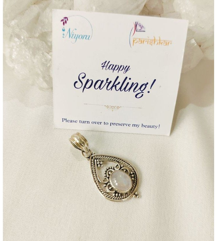 Elevate your style with our stunning Rainbow Moonstone Pendant, featuring a beautiful oval cabochon rainbow moonstone stone set in 92.5 sterling silver with an intricate pear-shaped design. This elegant piece is perfect for adding a touch of mystique to your look.