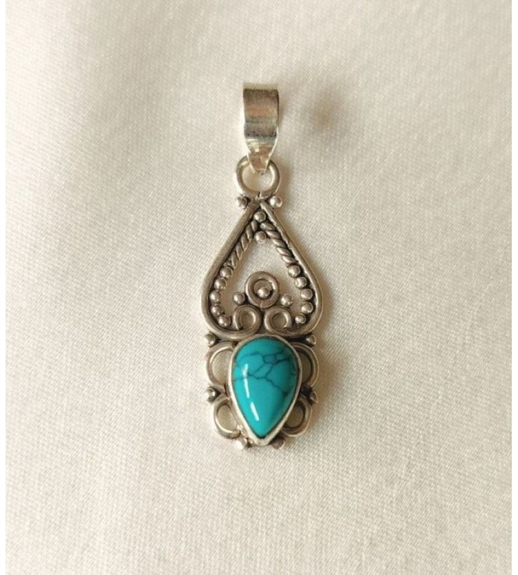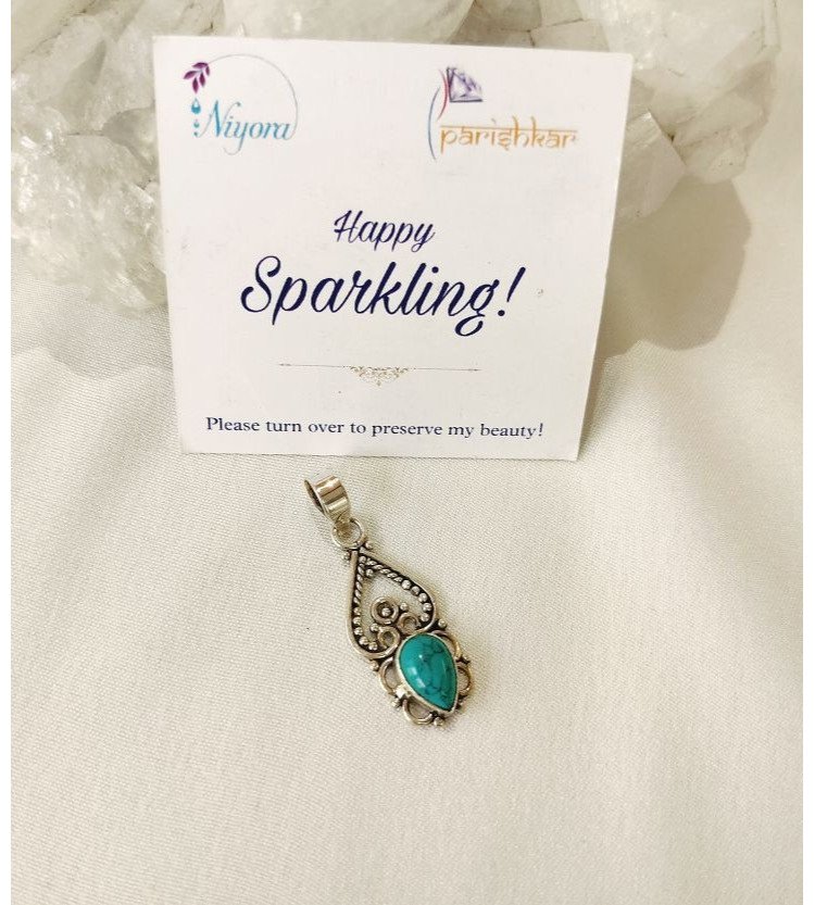 Elevate your style with our stunning Turquoise Pendant, featuring a beautiful turquoise stone set in 92.5 sterling silver with an intricate design. This elegant piece is perfect for adding a touch of serenity to your look.